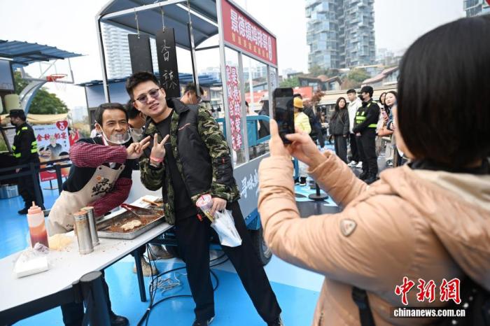 11月22日,来自江西景德镇的“鸡排哥”李俊永亮相成都烟火市集,引来民众围观。21日至23日,李俊永带着流动摊位与来自全国各地的73个烟火美食小店一起亮相成都麓客岛烟火市集,他将在3天时间里免费送出1000份鸡排,现场排起百米长龙。图为游客与李俊永(左)合影。中新社记者 张浪 摄