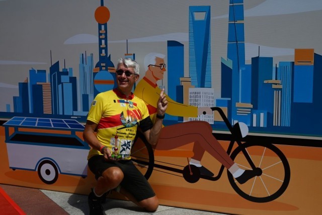年逾六旬的比利时骑行爱好者克劳德·布鲁尔今年在新疆、甘肃、陕西、上海等地骑行。
