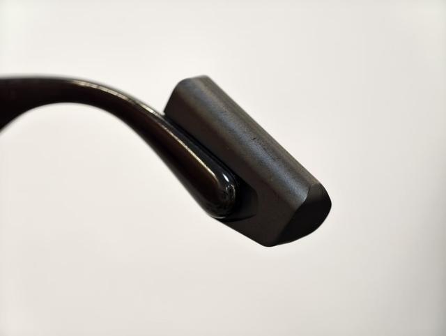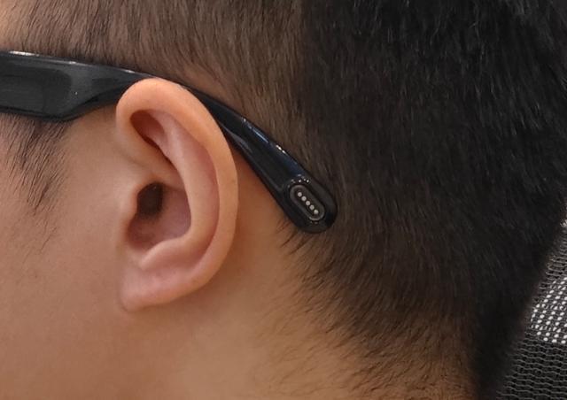 对于充电接口位置的选择,从最早的右侧镜腿中前部的电池下侧,到后来受堆叠限制改到了左镜腿尾部,再到考虑用户操作灵活方便,还是要放到右侧镜腿尾部。
